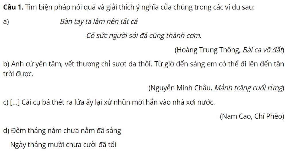 Câu 1. Tìm biện pháp nói quá và giải thích ý nghĩa của chúng trong các ví dụ sau: