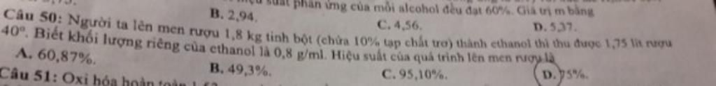 $m_{ethanol}=\dfrac{m_{tinh \,\, bột} \times 90\% \times \text{Hệ số tỷ lượng} \times H\% \times M_{ethanol} }{M_{tinh \,\, bột}}$