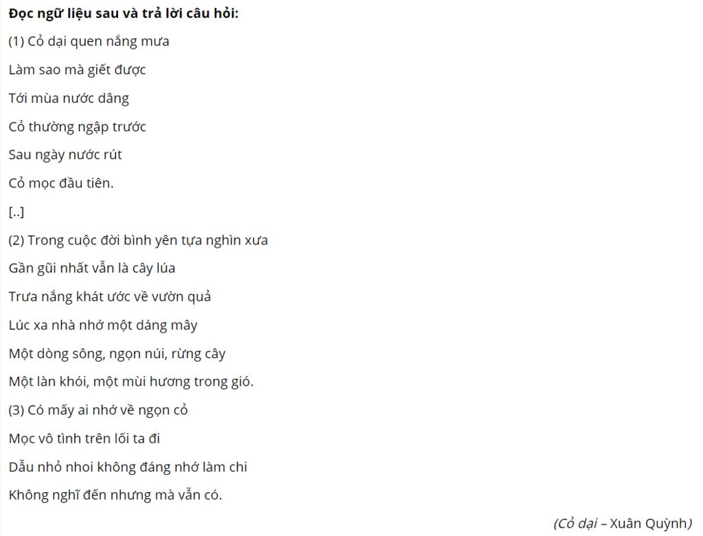 Hình ảnh cỏ dại trong bài thơ cùng tên của thi sĩ Xuân Quỳnh đã mang đến một vẻ đẹp tượng trưng cho sức sống bền bỉ và mãnh liệt. Dù cho cỏ có nhỏ nhoi, không được mọi người chú ý đến nhưng cỏ vẫn luôn luôn lặng lẽ sinh tồn. Dù cho có gió mưa, phong ba bão táp đến cách mấy thì cỏ vẫn không thể bị tiêu diệt.
