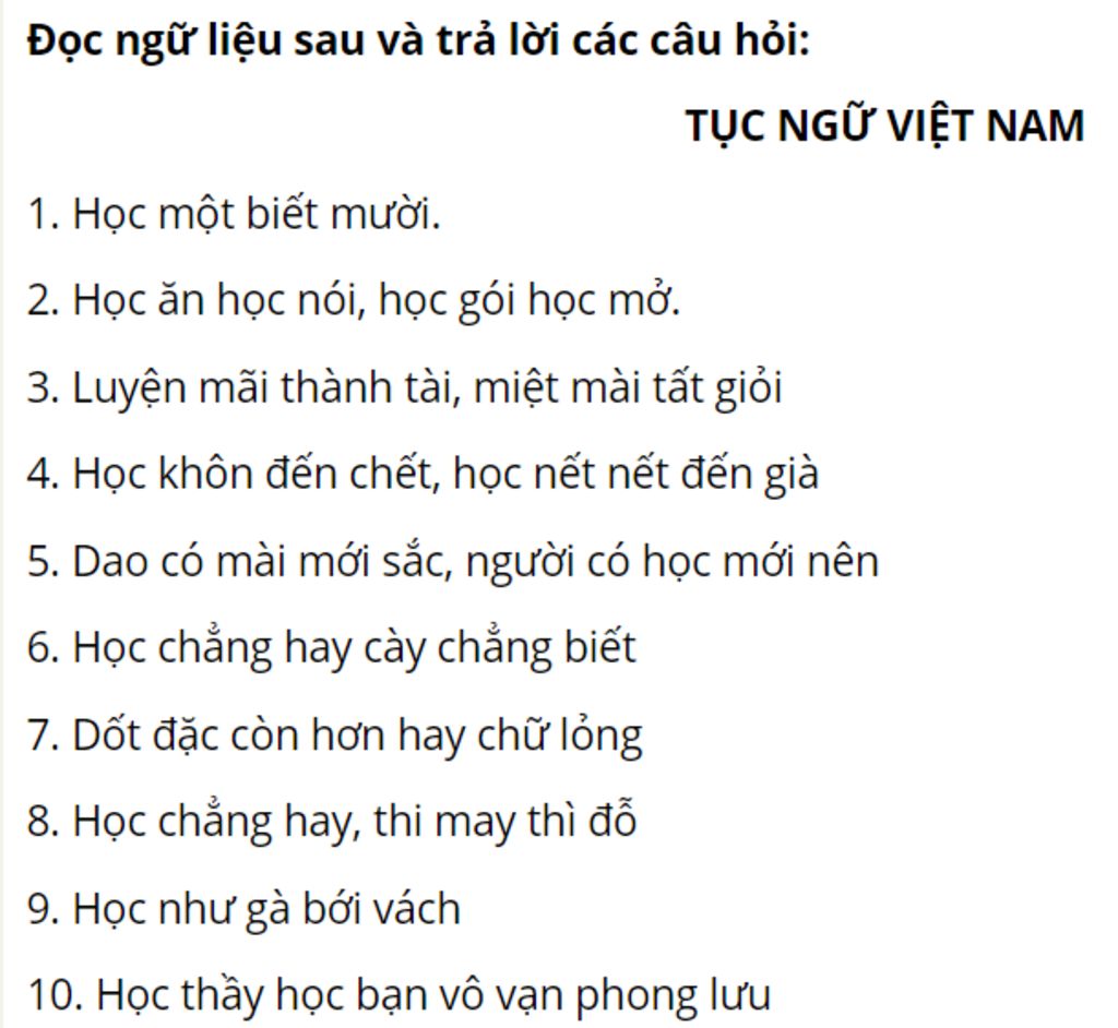 `@` Câu tục ngữ có lập luận chặt chẽ nhất là câu "Học ăn học nói, học gói học mở" chỉ ra là phải học từ những những điều nhỏ nhặt nhất