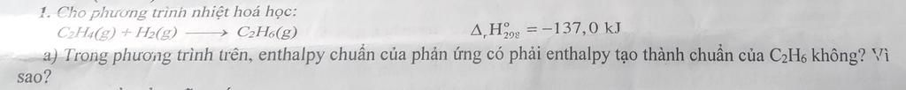 - Vì enthalpy chuẩn của phản ứng tương đương với tạo thành chuẩn của sản phẩm khi chất đó được tạo nên bởi nhiều đơn chất có `Δ=0`, còn trong trường hợp này có `C_2H_4` nữa nên nó không còn là tạo thành chuẩn của `C_2H_6`