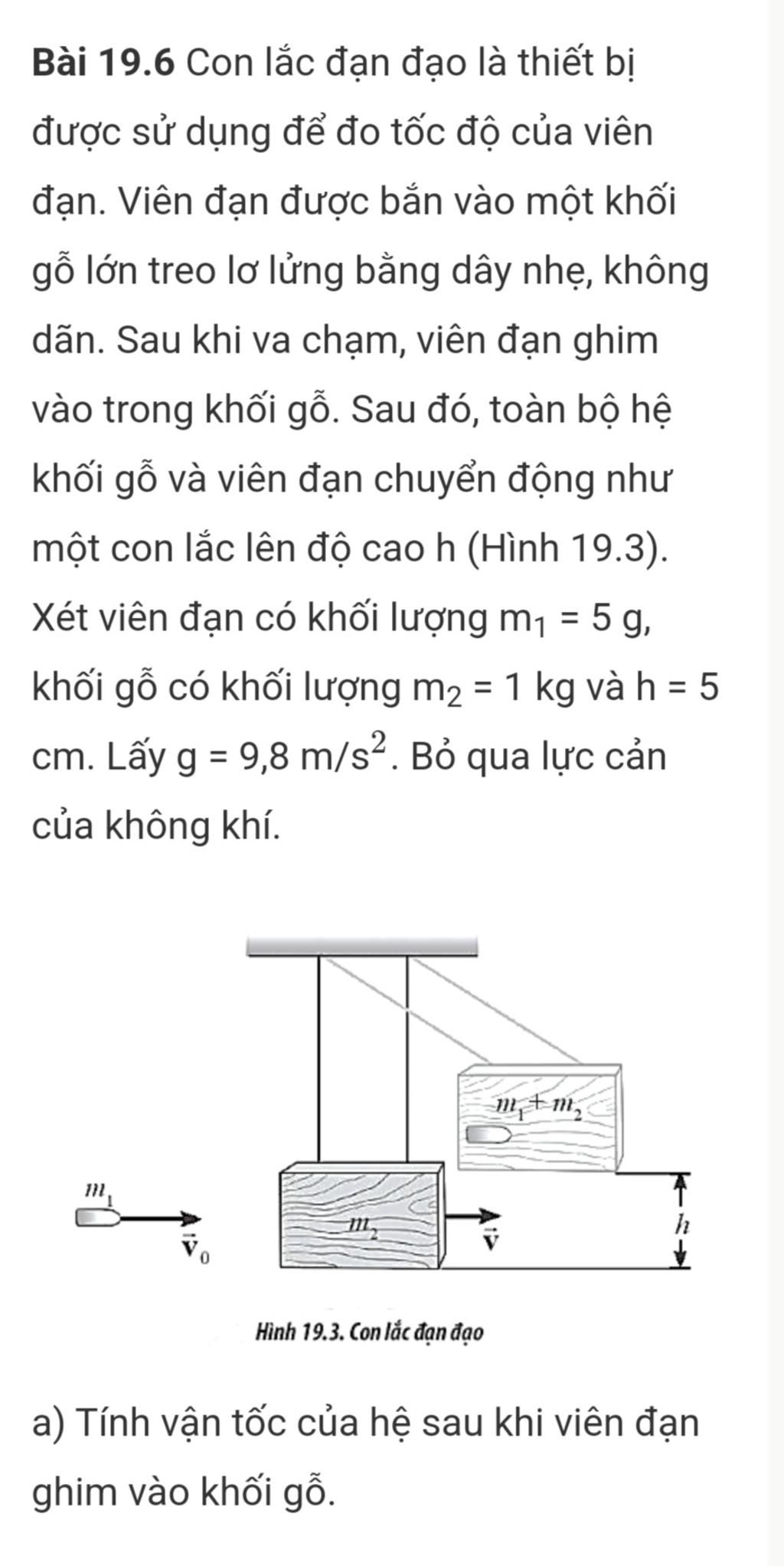 Gọi vận tốc của hệ ngay sau khi viên đạn ghim vào gỗ là `vecv` $(m/s)$.
