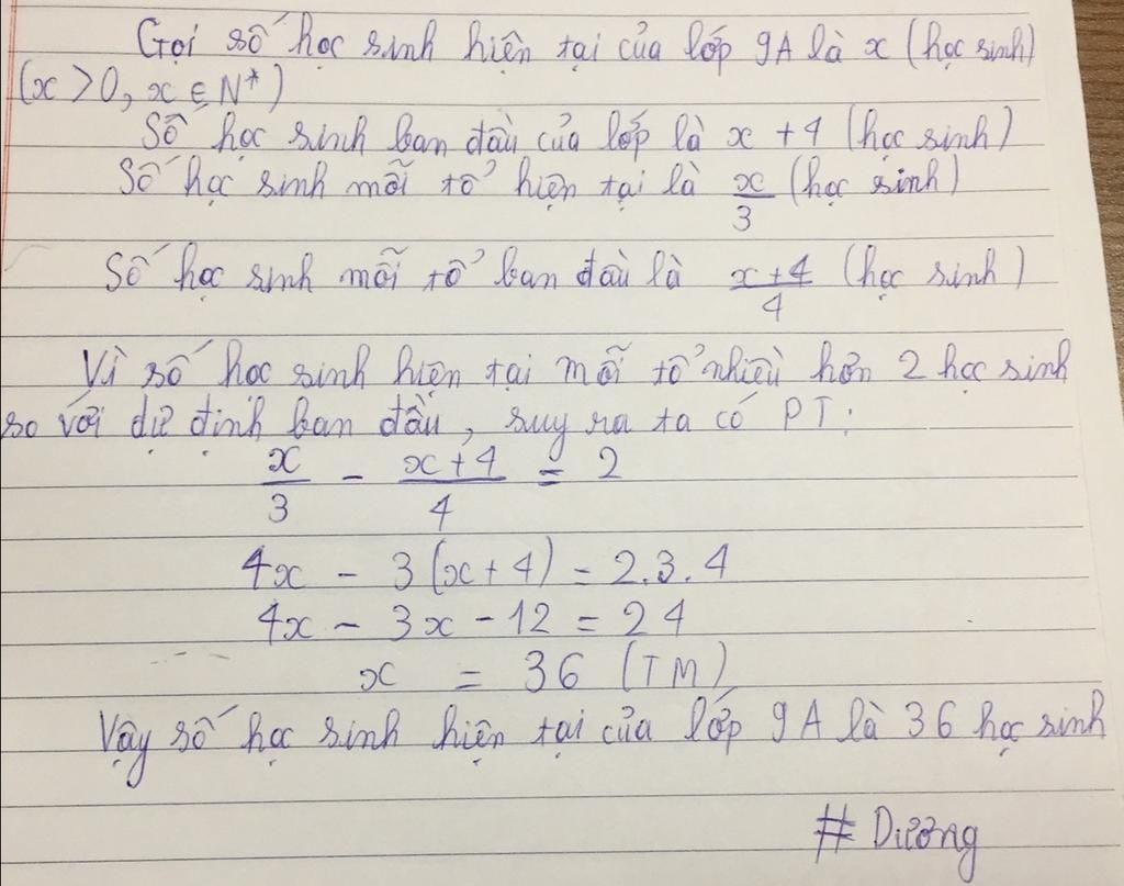 Khi mới nhận lớp 9A, cô giáo chủ nhiệm dự định chia lớp thành 4 tổ có số học sinh như nhau. nhưng sau khi khai giảng xong có 4 bạn chuyển đi. Đó đó, cô giáo chủ nhiệm thay đổi phương án và chia đều số học sinh còn lại thành 3 tổ. Hỏi lớp 9A hiện có bao nhiêu học sinh, biết răng số với phương án dự định ban đầu, số học sinh mỗi tổ hiện nay nhiều hơn 2 học sinh