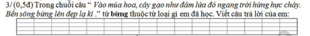 3/ (0,5đ) Trong chuỗi câu “ Vào mùa hoa, cây gạo như đám lửa đỏ ngang trời hừng hực cháy. Bến sông bùng lên đẹp lạ kì .” từ bùng thuộc từ loại gì em đã học. Viết câu trả lời của em: