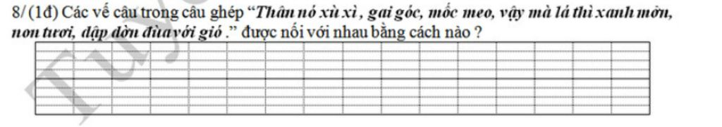 Các vế câu trong câu ghép trên được nối với từ vậy mà(quan hệ từ)(từ liên kết). Nó có tác dụng kết nối giữa “Thân nó xù xì, gai góc, mốc meo." và "lá thì xanh môn, non tươi, đập dờn đùa với gió" để phân chia ranh giới cho người đọc hiểu hơn.