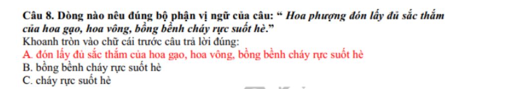 Câu 8. Dòng nào nêu đúng bộ phận vị ngữ của câu: “ Hoa phượng đón lấy đủ sắc thắm