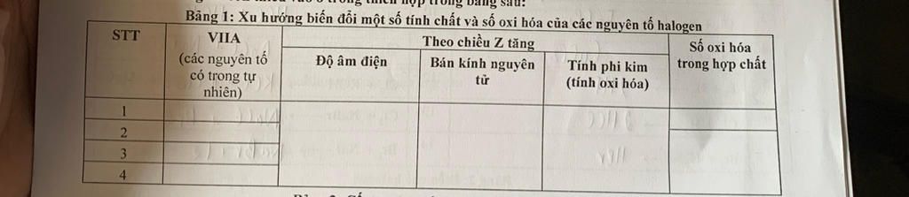 Bảng 1: Xu hướng biến đổi một số tính chất và số oxi hóa của các nguyên tố halogen