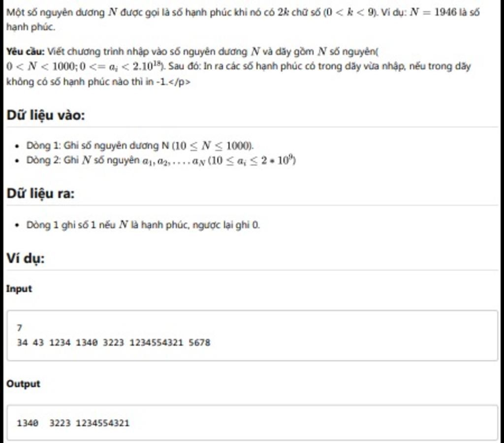 Một số nguyên dương N được gọi là số hạnh phúc khi nó có 2k chữ số (0 < k < 9). Vi dụ: N = 1946 là số