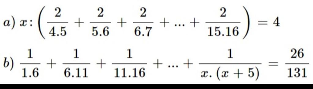 `a) x:(2/4.5+2/5.6+...+2/15.16)=4`