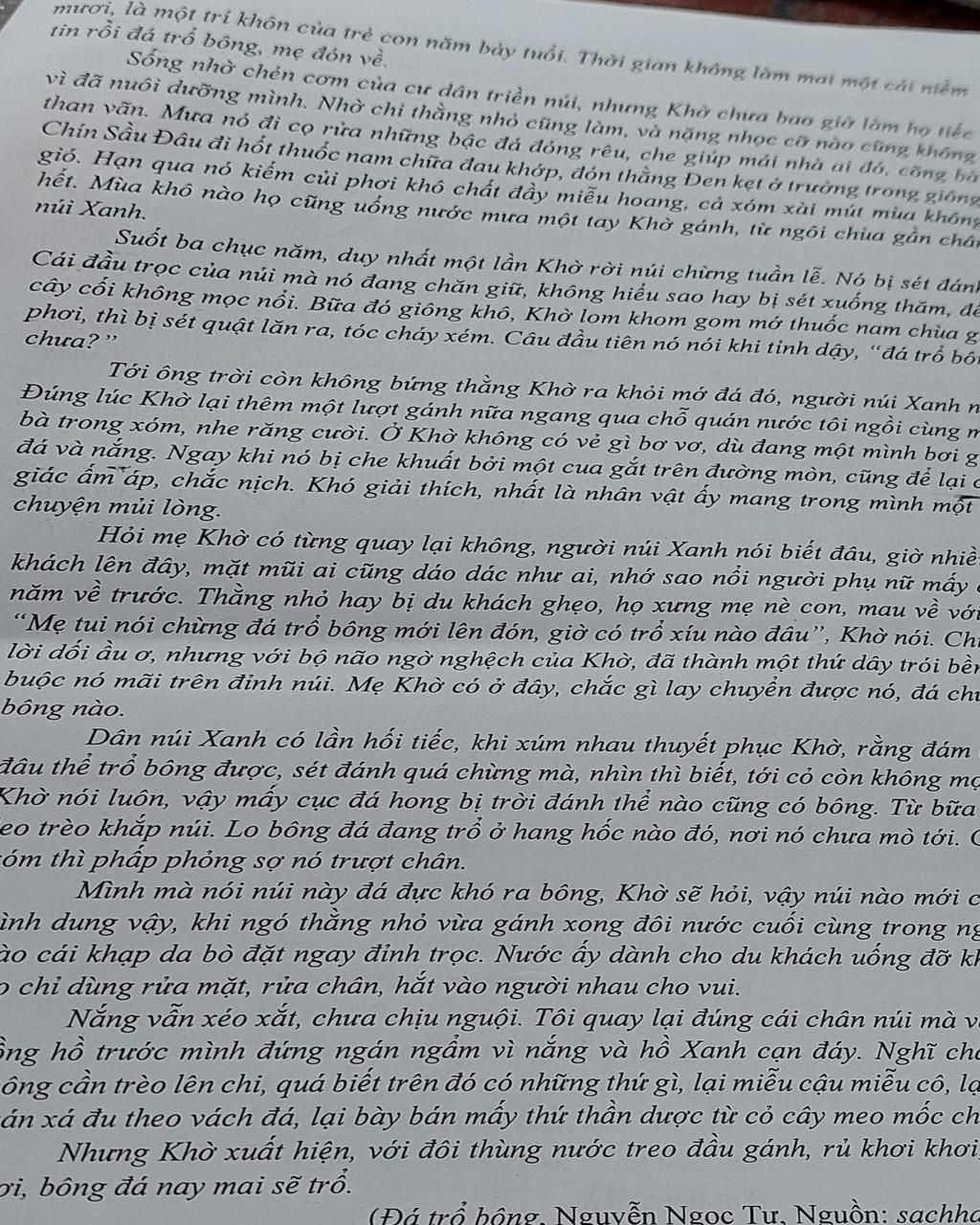 Hãy viết bài văn nghị luận bàn về tình yêu thương giữa con người với con người trong truyện Đá trổ bông của Nguyễn Ngọc Tư.