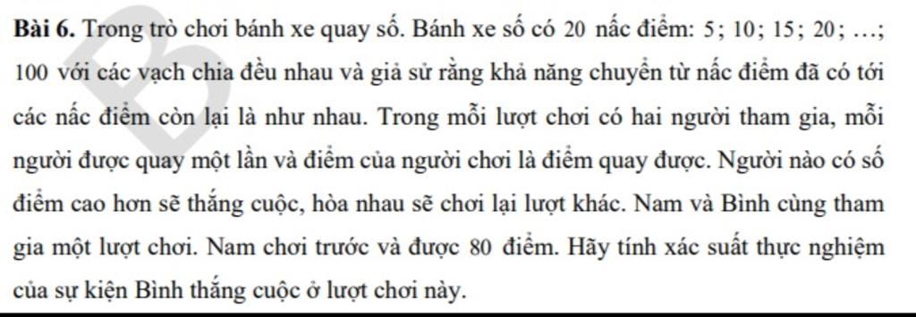 Vậy xác suất thực nghiệm củ sự kiện " Bình thắng cuộc ở trò chơi này" là 20%.