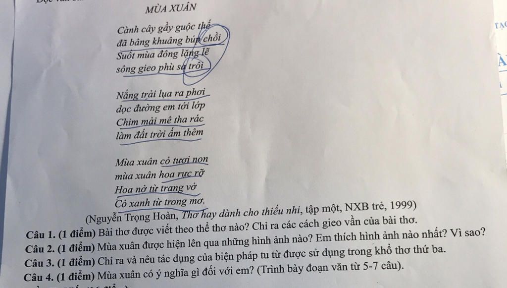 2. Mùa xuân được hiện lên qua những hình ảnh cành cây gầy guộc nay đã có búp chồi, sông gieo phù sa trôi, nắng trải lụa ra phơi dọc đường tới lớp, chim mải mê tha rác, đất trời ấm thêm, cỏ tươi non, hoa rực rỡ, hoa nở, cỏ xanh