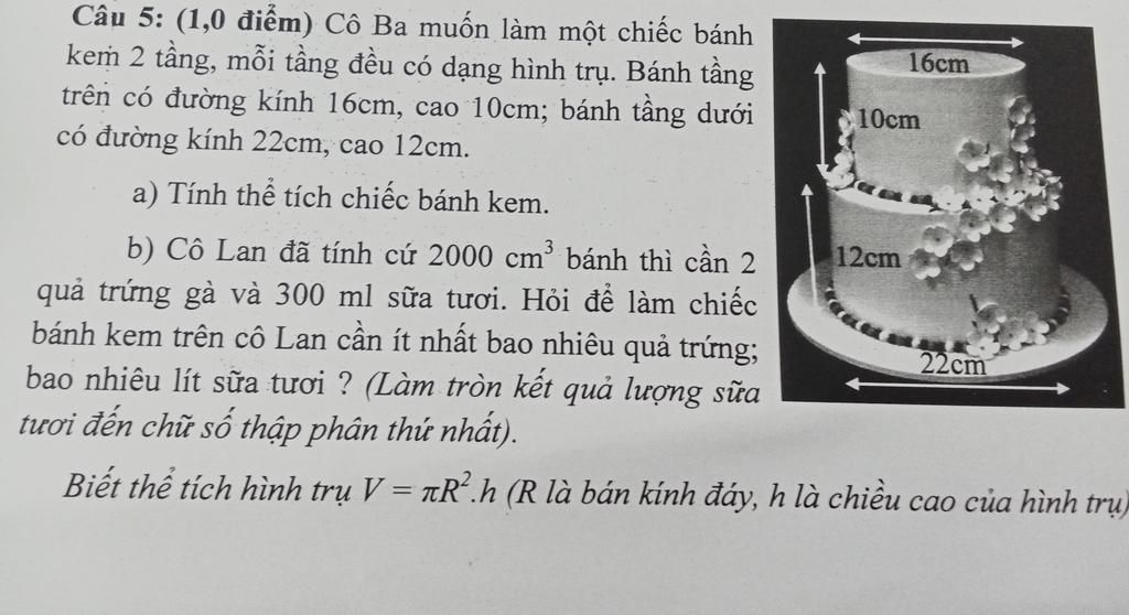 Câu 5: (1,0 điểm) Cô Ba muốn làm một chiếc bánh
