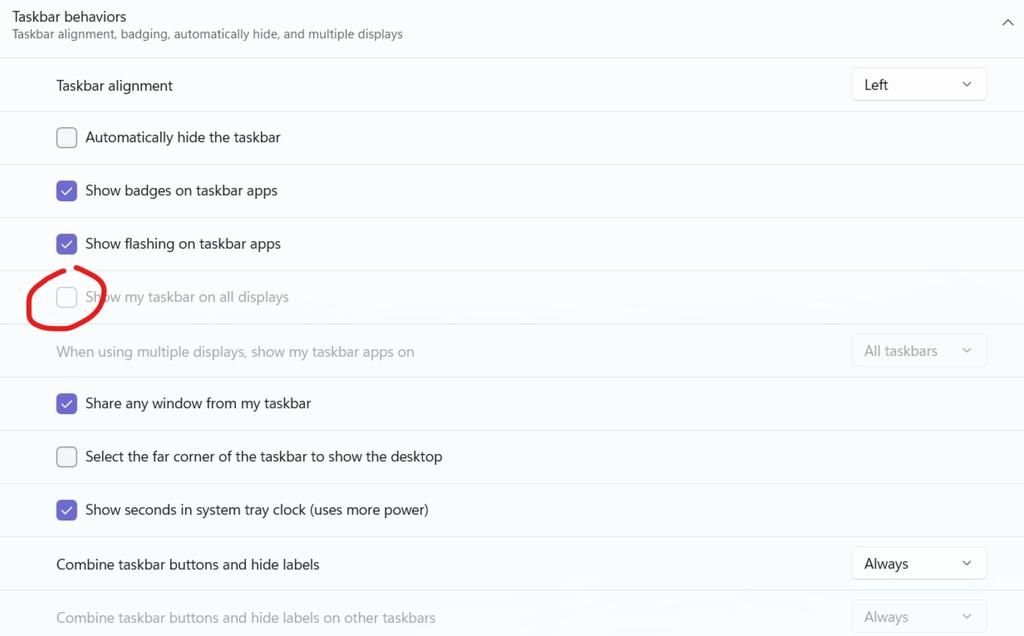 Có thể là bạn ấn vô một cái cài đặt về taskbar gì đó rồi nó không cho bạn nhấn "Show my taskbar on all display" nữa
