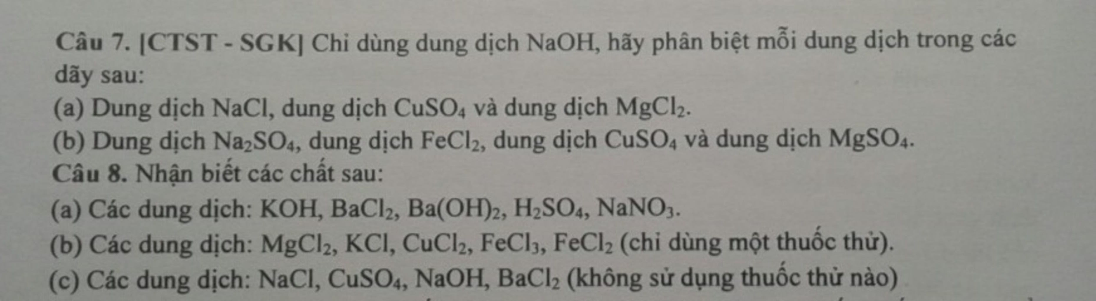Câu 7. [CTST - SGK] Chỉ dùng dung dịch NaOH, hãy phân biệt mỗi dung dịch trong các