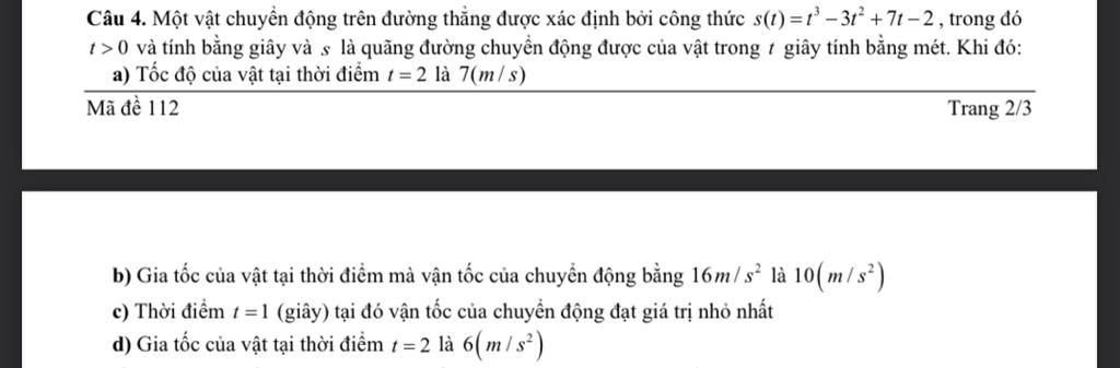 `v(t)=16<=>3t^2-6t+7=16<=>`\(\left[ \begin{array}{l}t=3\\t=-1\ (\text{loại})\end{array} \right.\)