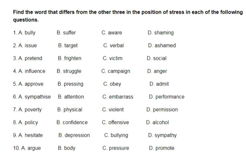 `3`, A nhấn trọng âm thứ 1 còn lại trọng âm 2