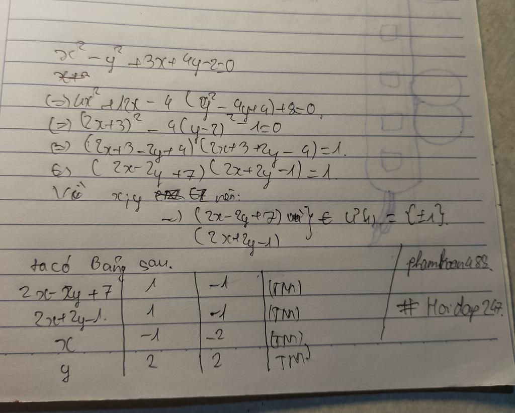 Khi đó: `(2x-2y+7); (2x+2y-1) ∈Ư(1)={±1}`