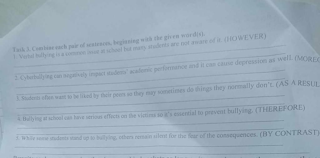 `5,` Some students stand up to bullying. By contrast, others remain for the fear of the consequences.