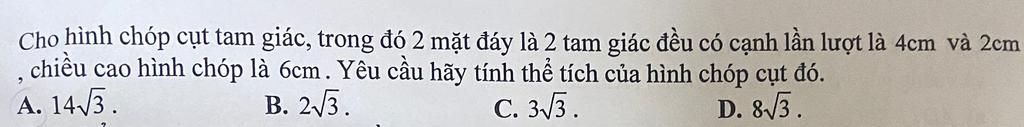 Mà đáy đó là tam giác đều à đó là 2 tam giác => 1 tam giác có cạnh = 2 và 1 tam giác có cạnh = 4