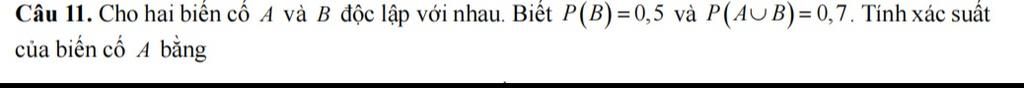 Vì 2 bc độc lập suy ra P(AB)=P(A).P(B)=0.5.P(A) P(A hợp B)=P(A)+P(B)-P(AB) 0.7= 0.5+P(A)-0.5.P(A) 0.2 = 0.5.P(A) P(A)=0.4