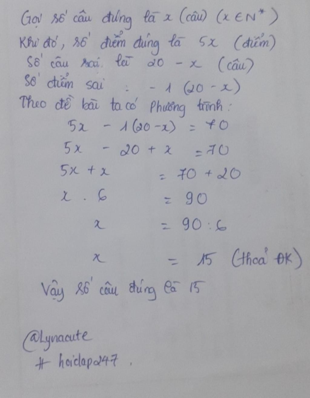Một cuộc thi có 20 câu hỏi với quy định cho điểm như sau: Với mỗi câu hỏi, nếu trả lời đúng thì được cộng 5 điểm, trả lời sai thì bị trừ 1 điểm, không trả lời thì không được điểm. Bạn Minh được 70 điểm trong cuộc thi đó. Hỏi bạn Minh đã trả lời đúng được bao nhiêu câu? Biết rằng bạn Minh đã trả lời tất cả các câu trong cuộc thi.
