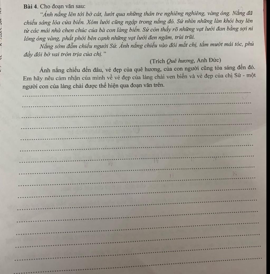 Làng Chài có một vẻ đẹp nhẹ nhàng, long lanh, với khung cảnh thơ mộng, một khung cảnh bình yên. Mỗi sáng sớm, lại có những tia nắng vàng rọi xuống mặt biển làm cho nặt biển như được phủ một lớp vàng óng ánh trông thật đẹp biết bao. Chị Sứ - một người con của làng Chài, chị cũng nhẹ nhàng, yểu điệu như mặt biển có những gợn óng lăn tăn vào mỗi sớm mai. Nắng sớm chiếu vào đôi mắt long lanh, to tròn của chị, còn những hạt sương long lanh phủ lên mái tóc và đôi bờ vai của chị càng làm khung cảnh thơ mộng của Làng Chài cùng người dân nơi đây chở nên êm dịu đén lạ!