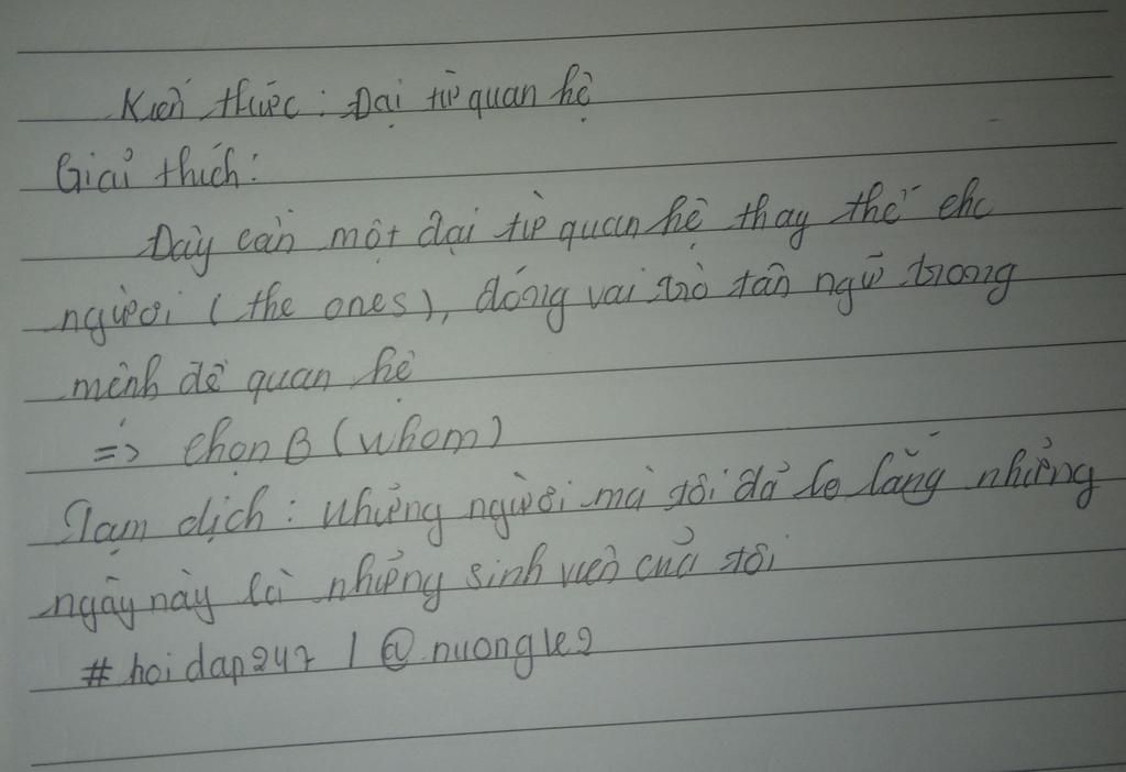 Đáp án : B bởi vì: + ''The students of mine'' là danh từ chỉ người nhưng lại được nhắc đến trong câu . *Sử dụng đại từ quan hệ ''whom'' . +Thêm giới từ ''about'' để chỉ rõ về người mà chủ ngữ ''I'' đang lo lắng đến . nghĩa tiếng việt: ng mà t lo lắng những ngày nay là những sv của tôi Rút gọnĐáp án : B bởi vì: + ''The students of mine'' là danh từ chỉ người nhưng lại được nhắc đến trong câu . *Sử dụng đại từ quan hệ ''whom'' . +Thêm giới từ ''about'' để chỉ rõ về người mà chủ ngữ ''I'' đang lo lắng đến . nghĩa tiếng việt: ng mà t lo lắn... xem thêm