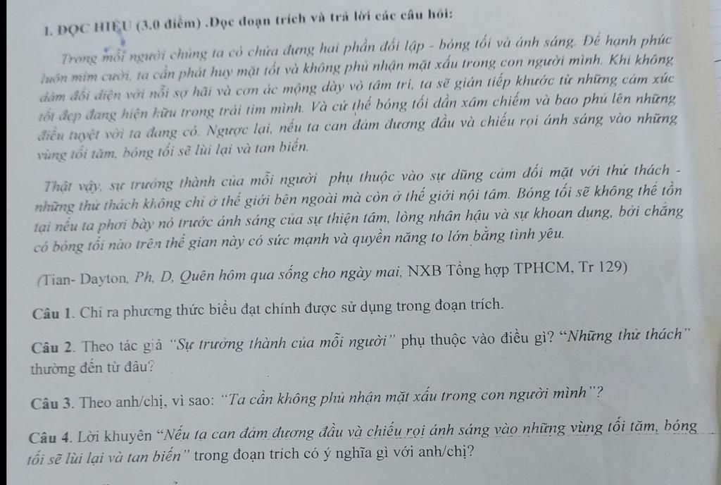 - "Sự trưởng thành của mỗi người phụ thuộc vào sự dũng cảm đối mặt với thử thách vì: Cuộc đời của mỗi con người đều gắn liền với những thử thách khó nhằn, chỉ vì yếu đuối, không tin tưởng vào năng lực bản thân, sợ thất bại mà không dám nhìn vào thử thách rồi đối mặt với chúng. Qua những thử thách, ta sẽ càng mạnh mẽ hơn bao giờ hết, nói đúng hơn, thử thách chính là những đà tiến để ta trưởng thành hơn từng ngày.