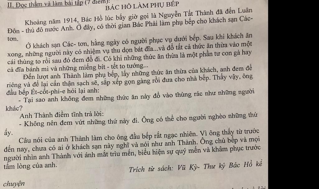 Qua câu chuyện Bác Hồ làm phụ bếp, chúng ta thấy được lòng yêu thương con người và sự tiết kiệm, không lãng phí của Bác Hồ. Đúng như câu: Đói cho sạch, rách cho thơm. Là người, ta phải biết giúp đỡ và cưu mang những người nghèo, cho họ có niềm tin vào cuộc sống, chiến thắng cái nghèo. Ta cũng phải biết trân quý và tiết kiệm những đồng tiền mà cha mẹ, chúng ta làm ra.