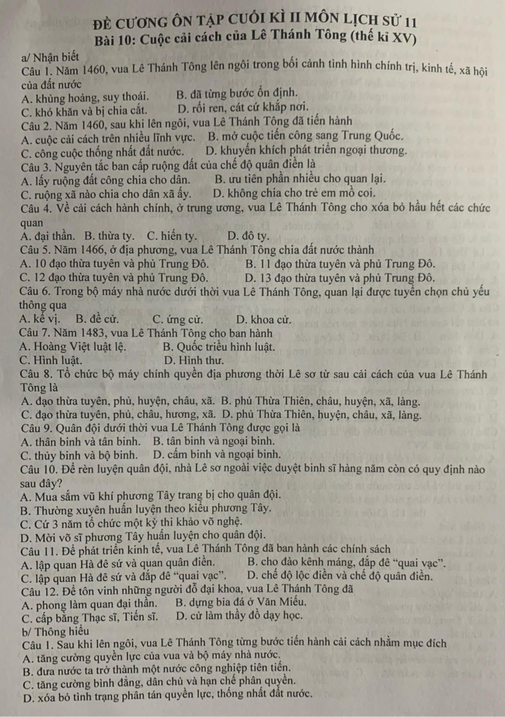 Câu 1. Năm 1460, vua Lê Thánh Tông lên ngôi trong bối cảnh tình hình chính trị, kinh tế, xã hội