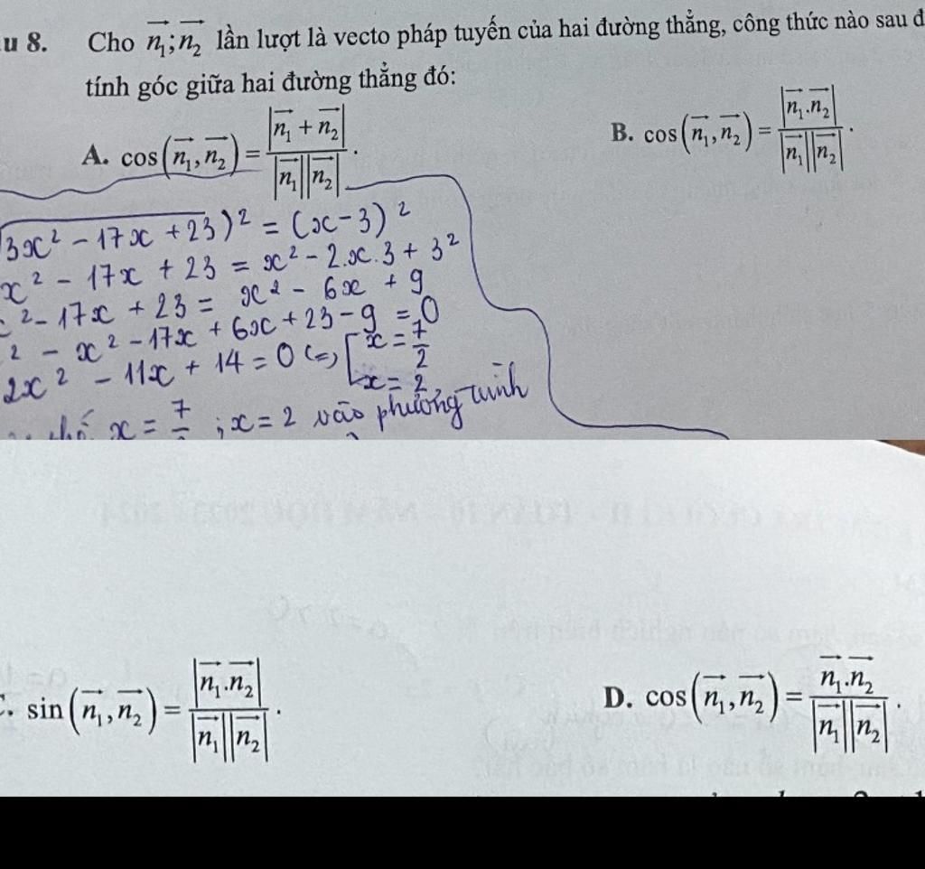 Cho mịn, lần lượt là vecto pháp tuyến của hai đường thẳng, công thức nào sau đ
