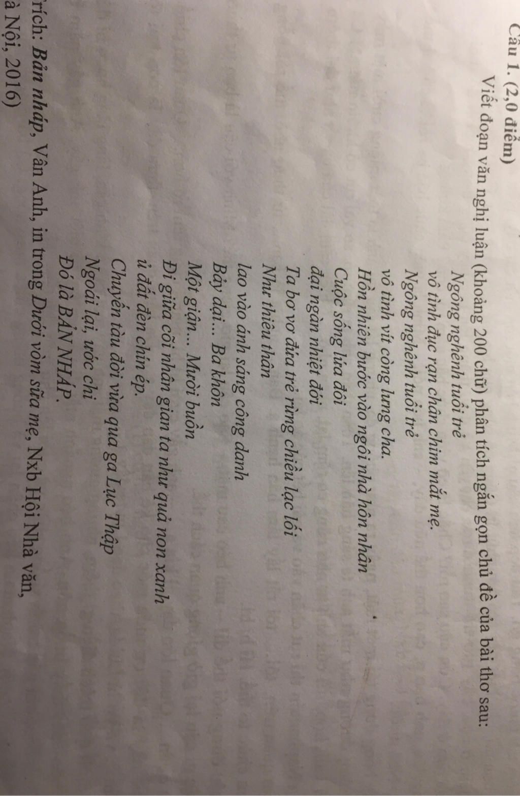 Chủ đề của bài thơ Bản nháp của tác giả Vân Anh là về cuộc đời, hành trình lớn lên của mỗi người trong cuộc sống. Khi chúng ta còn trẻ, chúng ta nhận được tình yêu thương vô điều kiện và sự chở che của cha mẹ và gia đình. Để nuôi lớn và dạy dỗ chúng ta, cha mẹ đã hy sinh và chịu đựng nhiều vất vả và nhọc nhằn. Sau khi chúng ta trở thành những người lớn trưởng thành, chúng ta đã phải tự lập bước đi từng bước trong hành trình mới của mình. Mỗi người phải lo lắng cho sự nghiệp công danh của bản thân mình và tự vun đắp, xây dựng cho tổ ấm gia đình của mình. Chặng đường mới có lúc vui, lúc buồn, ngập tràn những thăng trầm, vất vả, thậm chí là sóng gió buộc ta phải trưởng thành, khôn lớn, vững vàng để đương đầu. Ở trong giai đoạn này, chúng ta bị cuốn theo nhịp sống bận rộn của cuộc đời để rồi bắt buộc phải trưởng thành. Giai đoạn cuối cùng là khi ta già, ước nguyện lúc này có lẽ là những năm tháng cuộc đời có thể trôi qua chậm hơn để có thể sửa chữa những lỗi lầm và thực hiện những điều mình chưa làm. Tóm lại, chủ đề của bài thơ là những giai đoạn của cuộc đời của con người và triết lý đầy sâu sắc, nhân văn.