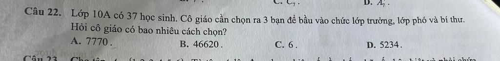 Có `37` học sinh chọn ra `3` bạn để bầu vào lớp trưởng , lớp phó và bí thứ