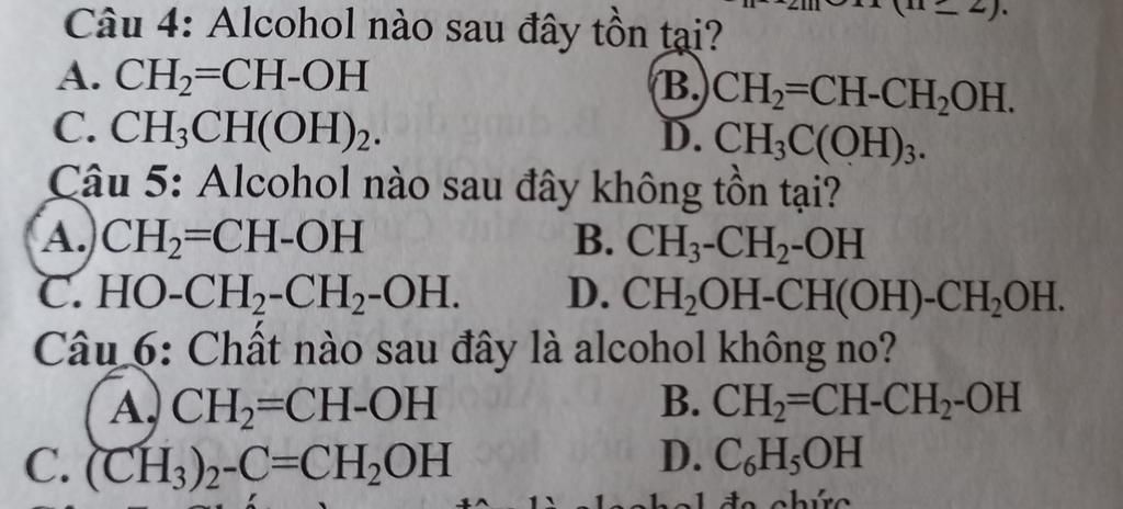 Alcohol không no có liên kết bội $C=C$ (không thuộc vòng benzene) hoặc $C\equiv C$ hoặc cả hai nhưng phải thoả mãn điều kiện bền của alcohol.