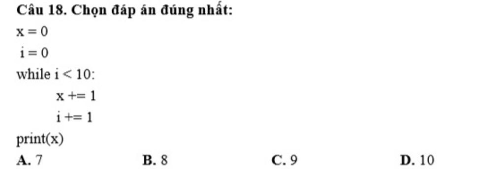 VÒng lặp chay được 10 lần, biến i có giá trị từ 0 - 10, mỗi lần lặp x cộng thêm 1 nên x=10