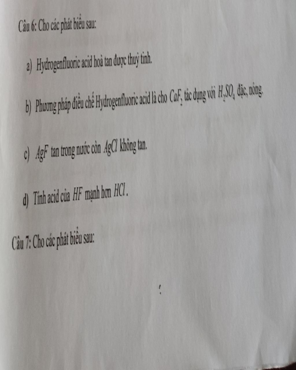 d, Sai. Liên kết $H-F$ bền vững hơn $H-Cl$ vì độ dài liên kết nhỏ, $F$ có độ âm điện lớn, bán kính nguyên tử $F$ nhỏ nên $H^+$ trong $HF$ khó phân li ra hơn trong $HCl$. Vậy tính acid của $HCl$ lớn hơn $HF$.