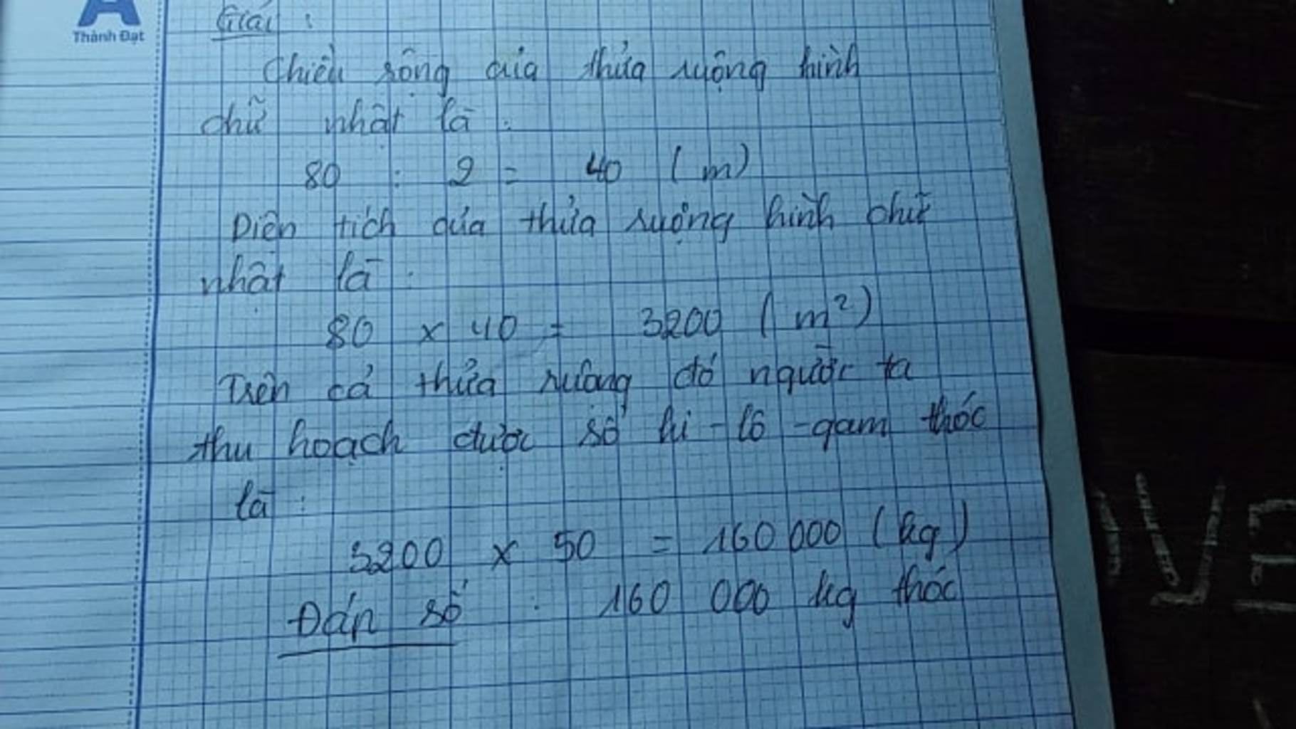 Giải thích Một thửa ruộng hình chữ nhật có chiều dài 80m và gấp đôi chiều rộng, cứ 100m2 thu hoạch được 50kg thóc. Hỏi cả thửa ruộng người ta thu hoạch được số kg thóc là?