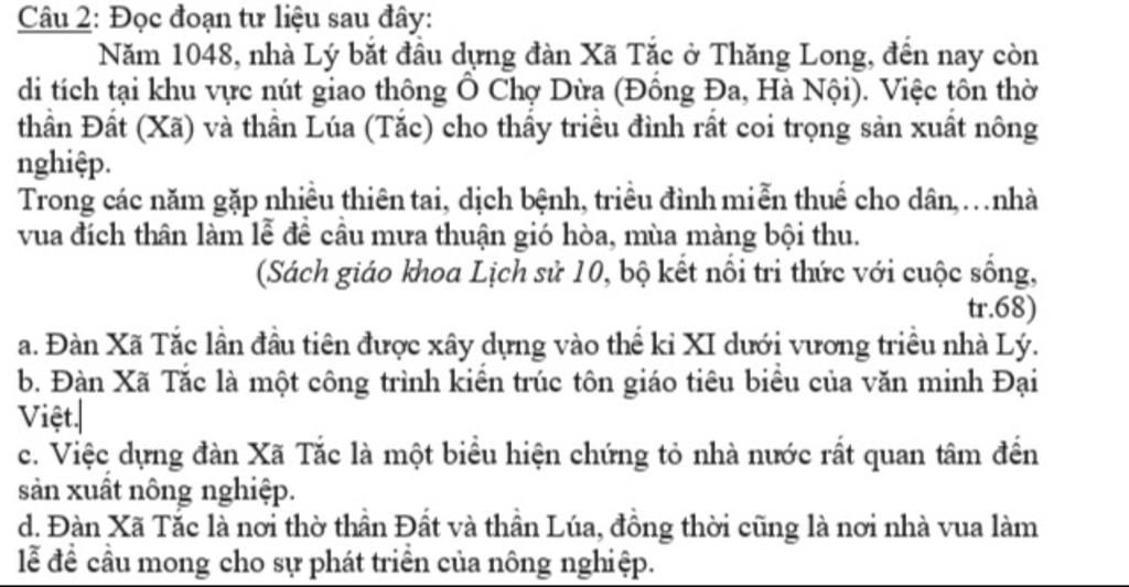 d. Đàn Xã Tắc là nơi thờ thần Đất và thần Lúa, đồng thời cũng là nơi nhà vua làm lễ để cầu mong cho sự phát triển của nông nghiệp