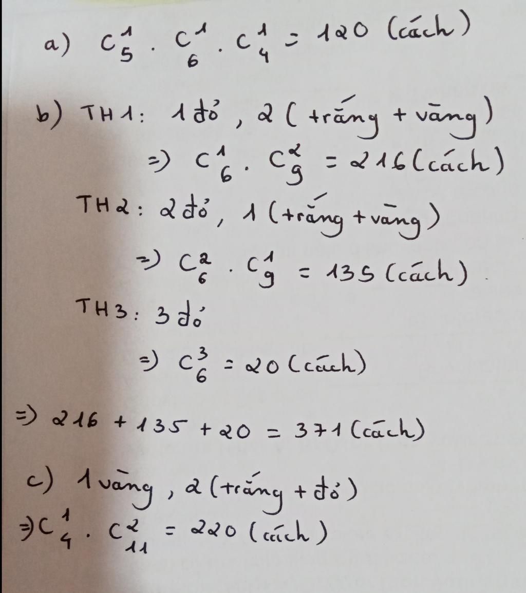 Câu c Bạn ko lm trường hợp 1 vàng,1 đỏ,1 trắng ạ