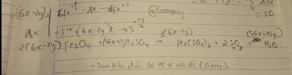`2(6x-2y)Fe_3^(+8//3)O_4 +(56x+20y) H_2S^(+6)O_{4\ đặc, nóng}-> 3(6x-2y)Fe_2^(+3)(SO_4)_3 + 2S_(x)^((2y)/x)O_(y) + (56x+20y)H_2O`
