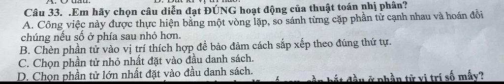 Câu 33. .Em hãy chọn câu diễn đạt ĐÚNG hoạt động của thuật toán nhị phân?