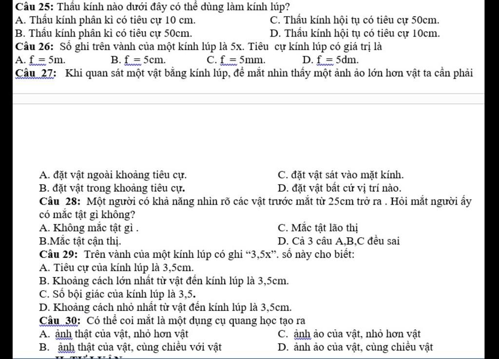 Thấu kính hội tụ có tiêu cự 10cm có thể dùng làm kính lúp.