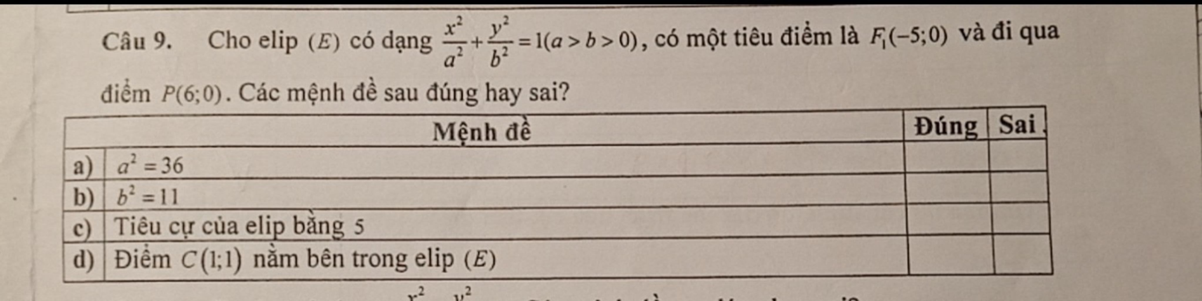 Câu 9. Cho elip (E) có dạng =1(a>b>0), có một tiêu điểm là F(−5;0) và đi qua