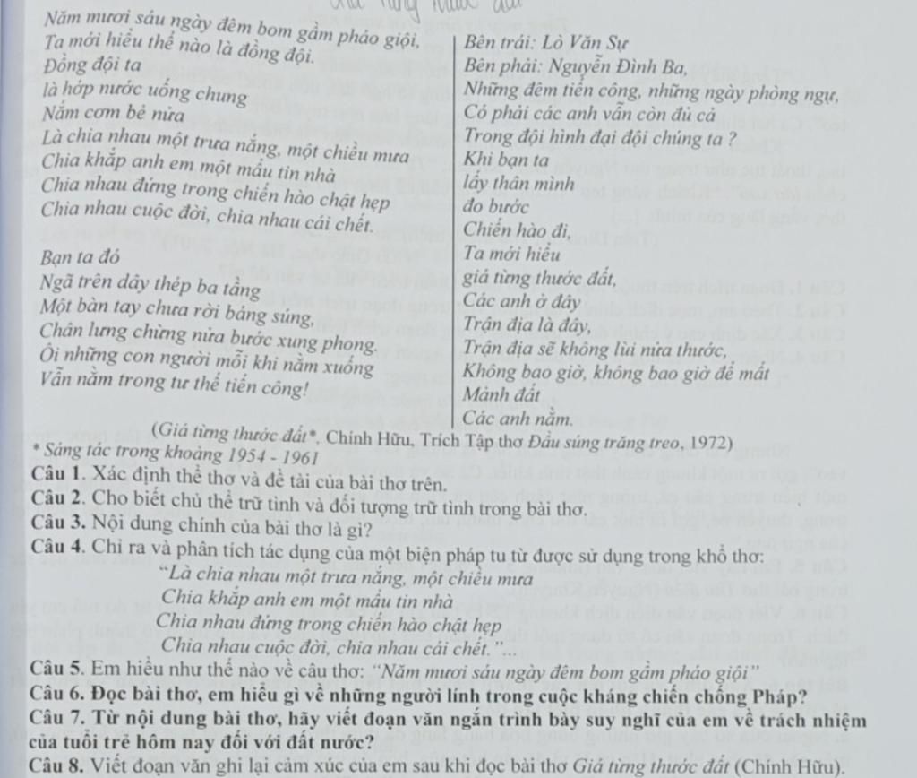 `→` Nhắc tới thơ, ta không khỏi không nghĩ tới nhà thơ Chính Hữu `-` một nhà thơ tài ba trong nền văn học đại tài. Nổi bật phải kể tới, có lẽ là tác phẩm "Giá từng thước đất" với những tư tưởng, ý nghĩa sâu xa về một tình đồng đội, đồng chí cao đẹp. Bài thơ toát lên là bối cảnh trận địa quân đội ta đang anh dũng đánh Pháp, mặc cho biết nguy hiểm, cái chết cận kề nhưng bộ đội ta vẫn đồng tâm hiệp lực, nhất trí chiến đấu bằng được để giữ cho được từng thước đất thiêng liêng của Tổ Quốc. Họ đã biết “chia nhau cái chết”, biết chia nhau cả cái vinh quang được hy sinh vì đất nước `-` sự hi sinh thiêng liêng, cao quý đến vô cùng. Đọc xong bài thơ, tôi không khỏi không ngỡ ngàng và cảm phục trước tinh thần đồng đội bền chặt, gắn kết da diết ấy. Hình ảnh những người lính Điện Biên sẽ mãi là hình ảnh sáng lóa, đại diện cho sự thấu hiểu, sẻ chia và tình yêu Tổ Quốc, yêu đất nước sâu sắc của con dân Việt Nam.