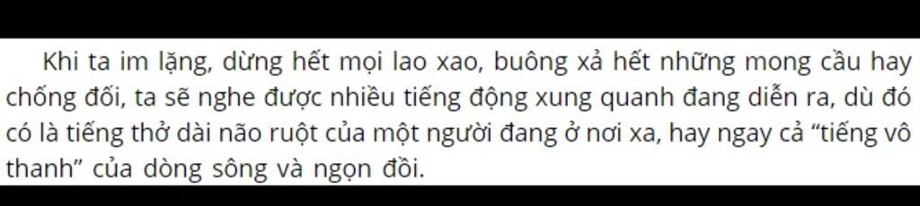 Khi ta im lặng, dừng hết mọi lao xao, buông xả hết những mong cầu hay chống đối, ta sẽ nghe được nhiều tiếng động xung quanh đang diễn ra, dù đó có là tiếng thở dài não ruột của một người đang ở nơi xa, hay ngay cả “tiếng vô thanh” của dòng sông và ngọn đồi.