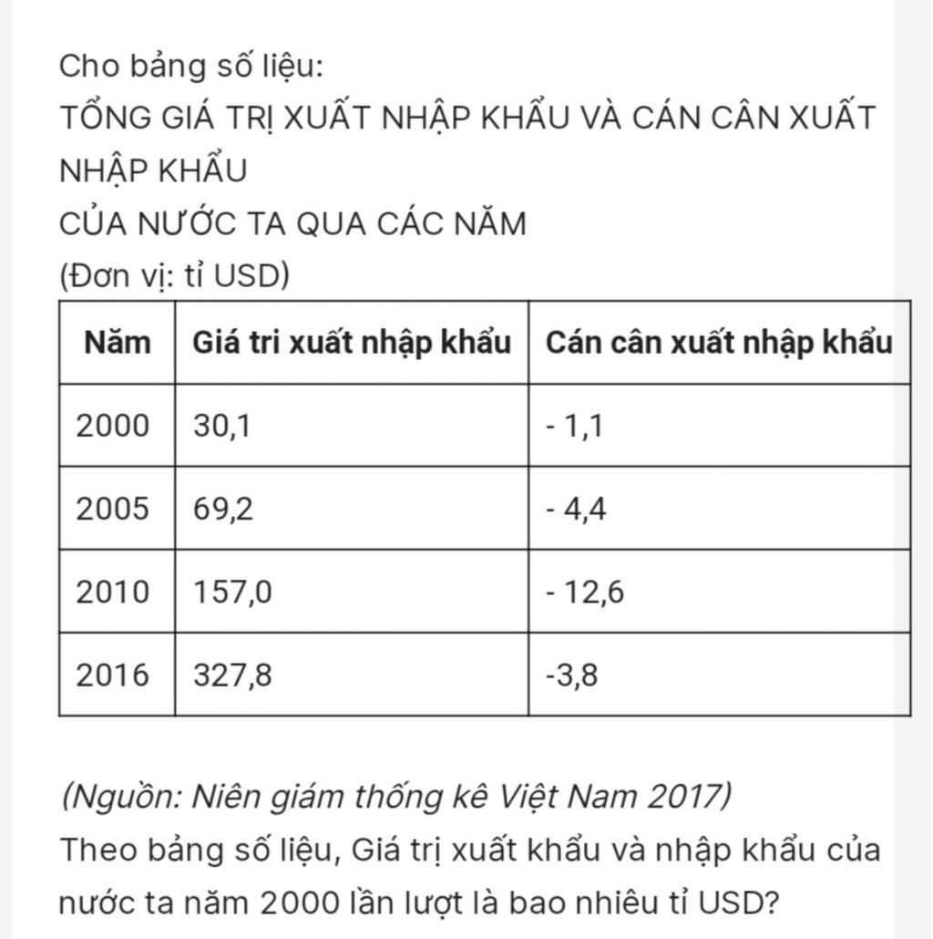 `color{red}bbtext{Công thức:}`$\\$ `@` Cân cân xuất nhập khẩu $=$ Giá trị xuất khẩu `-` Giá trị nhập khẩu$\\$ `@` Tổng giá trị xuất nhập khẩu $=$ Giá trị xuất khẩu $+$ Giá trị nhập khẩu$\\$ `=>` Giá trị nhập khẩu $=($Tổng giá trị xuất nhập khẩu $+$ Cán cân xuất nhập khẩu$):2$$\\$ `=>` Giá trị xuất khẩu $=$ Tổng giá trị xuất nhập khẩu $-$ Giá trị nhập khẩu$\\$ `color{green}bbtext{Trả lời:}`$\\$ Giá trị nhập khẩu của nước ta năm `2000`:$\\$ $\dfrac{30,1-1,1}{2}=14,5($tỉ USD$)$$\\$ Giá trị xuất khẩu của nước ta năm `2000`:$\\$ `30,1-14,5=15,6(`tỉ USD$)$$\\$ `=>` Giá trị xuất khẩu, nhập khẩu lần lượt là `15,6` và `14,5` tỉ USD.