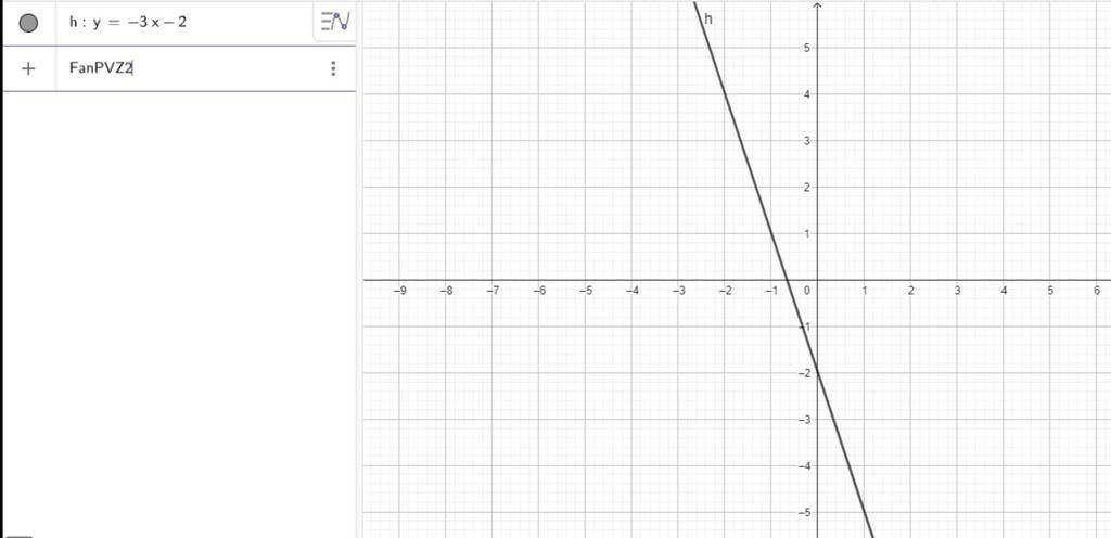 Cho hàm số y = -3x - 2 có đồ thị là (d) [NB] Xác hệ số a, b của hàm số trên. Đồ thị (d) của hàm số cắt trục tung Oy tại điểm có tung độ là bao nhiêu? [NB] Cho đường thẳng (d): y = ax + 10. Xác định giá trị củaa a để đường thẳng (d') cắt (d) [VD] Vẽ đồ thị hàm số y = - 3x - 2 (d)