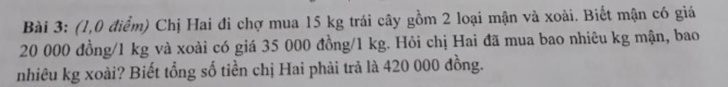 Đáp án: Chị Hai mua $7$ kg mận và $8$ kg xoài