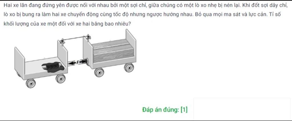 Hai xe lăn đang đứng yên được nối với nhau bởi một sợi chỉ, giữa chúng có một lò xo nhẹ bị nén lại. Khi đốt sợi dây chỉ, lò xo bị bung ra làm hai xe chuyển động cùng tốc độ nhưng ngược hướng nhau. Bỏ qua mọi ma sát và lực cản. Tỉ số khối lượng của xe một đối với xe hai bằng bao nhiêu?